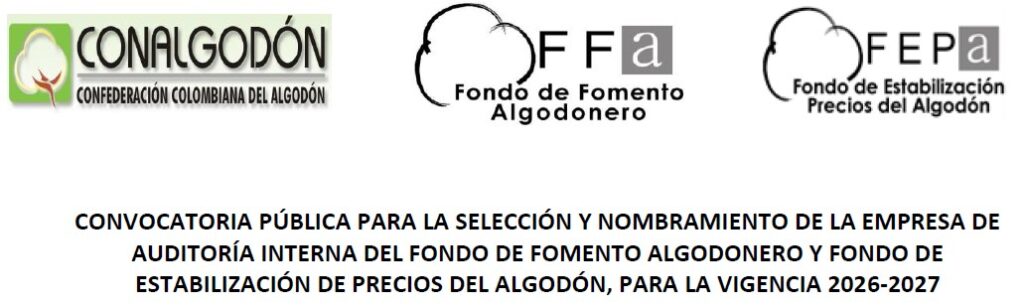 Bogota 31 de marzo de 2026 Nos permitimos presentar, los términos de referencia selección de la Auditoría Interna para el periodo 2026-2027, de los siguientes Fondos Parafiscales: Fondo de Fomento Algodonero – FFA Fondo de Estabilización Precios del Algodón – FEPA. Plazo presentación propuesta: Hasta el 13 de abril de 2026. Proceso-Seleccion-Auditoria-Interna-Fondos-Para-Fiscales-Algodon-Vigencia-2026-2027.pdf
